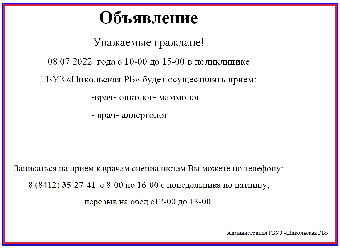 ГБУЗ «Никольская РБ» будет осуществлять прием: