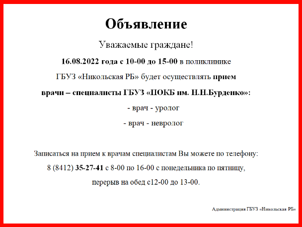 ГБУЗ «Никольская РБ» будет осуществлять прием